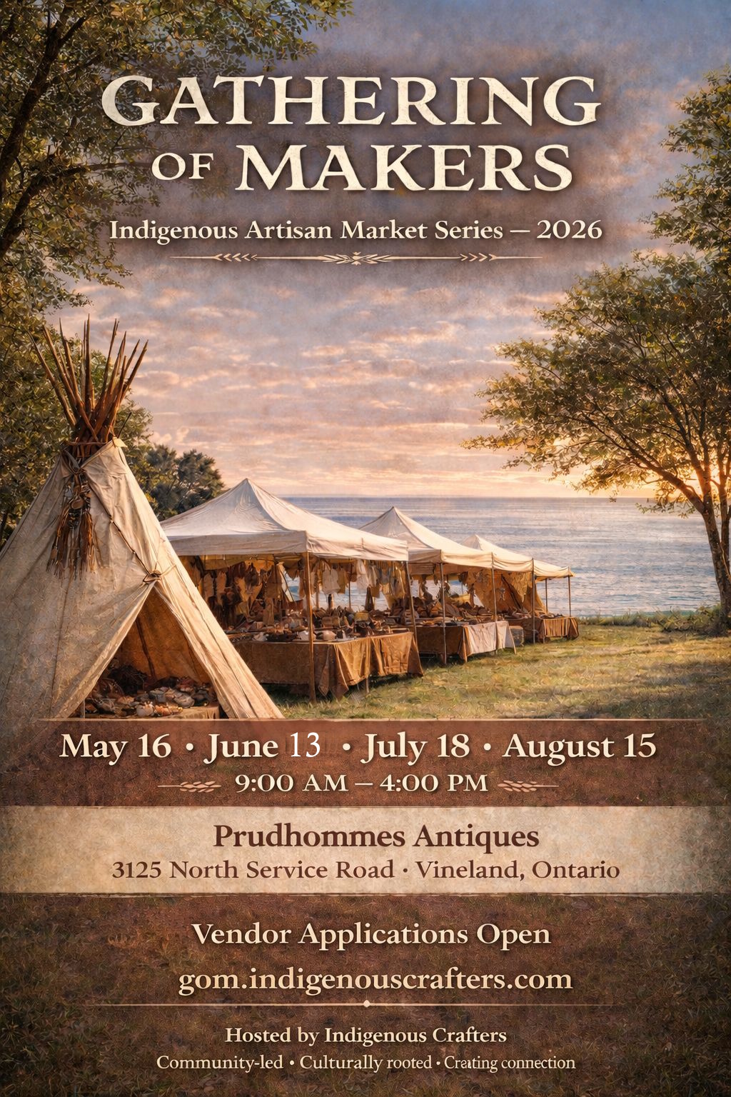 FOUR-DATE MARKET SERIES May 16 · June 13 · July 18 · August 15 9:00 AM – 4:00 PM Prudhommes Antiques, Vineland Ontario The Gathering of Makers is a seasonal Indigenous artisan market series celeb...